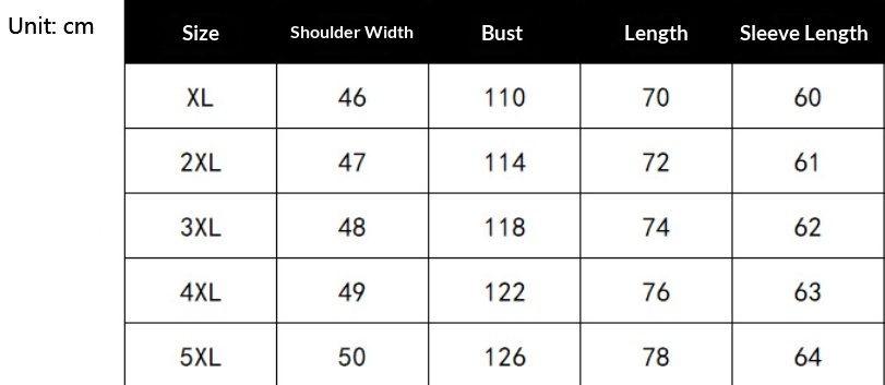 Size: XL, 2XL, 3XL, 4XL, 5XL