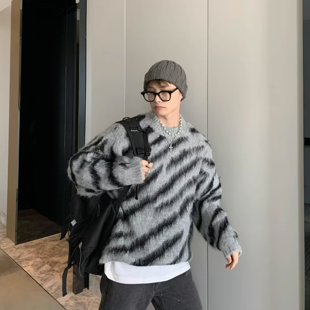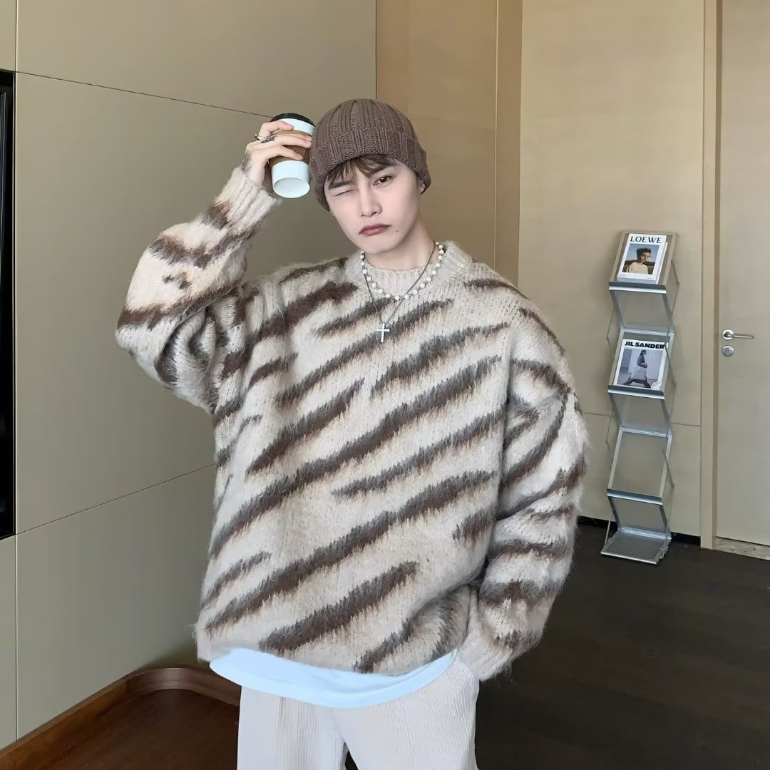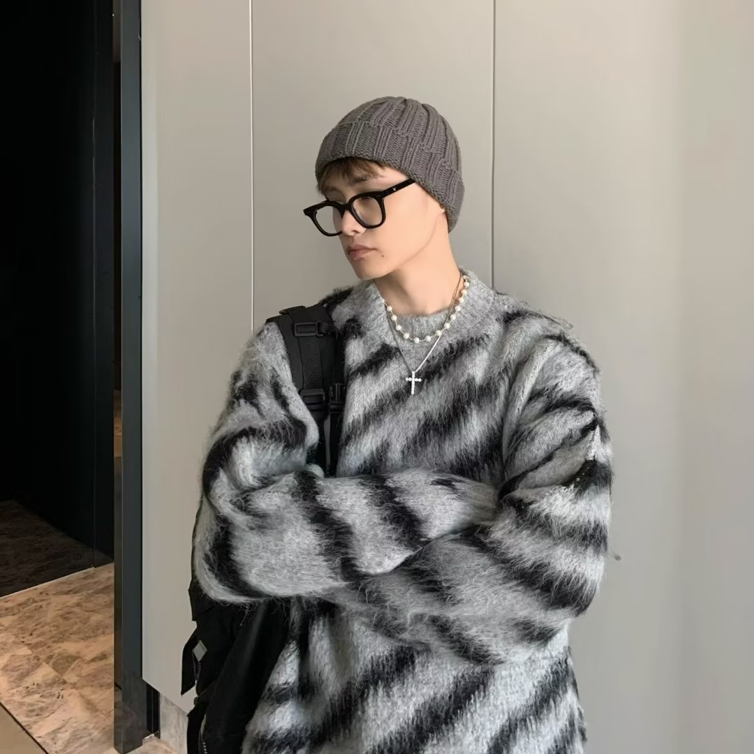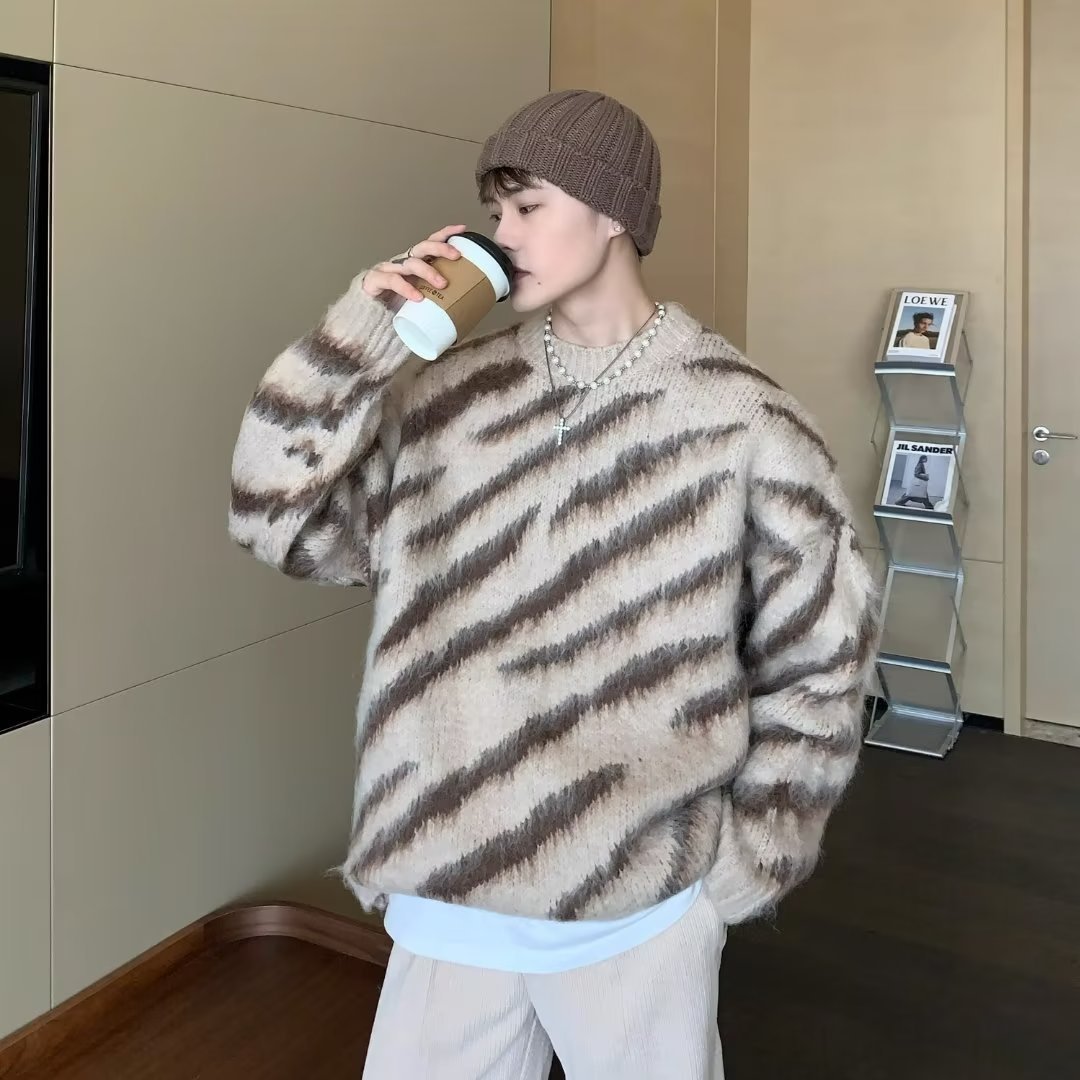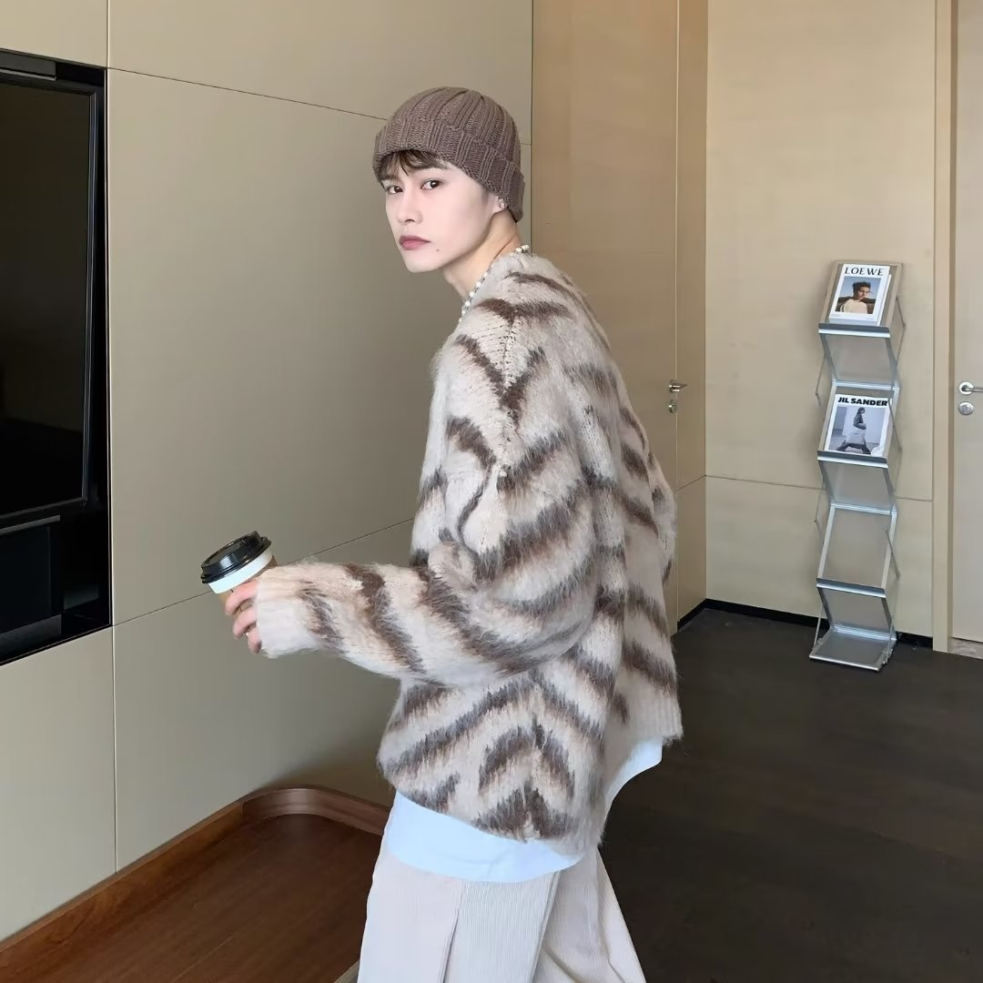 Zebra Stripe Retro Cardigan Men's Loose Knit Sweater